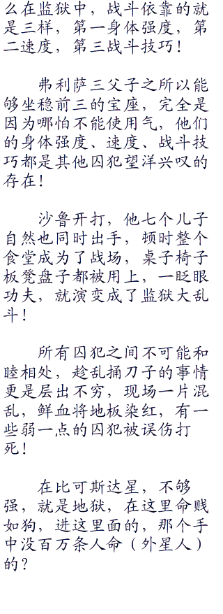 比可斯达星监狱,带头的就是弗利萨三父子,不过他们又处于竞争关系,尤其是古拉和弗利萨关系相当的恶劣,旗下的马仔时不时的发生火拼。有意思.书院首发