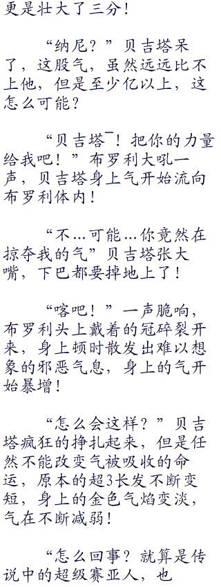 超4状态下的赛莉巴和超3下的贝吉塔实力半斤八两,打得难解安分,吓得帕拉伽斯屁股尿流,连滚带爬,躲得远远的,深怕被波及到!