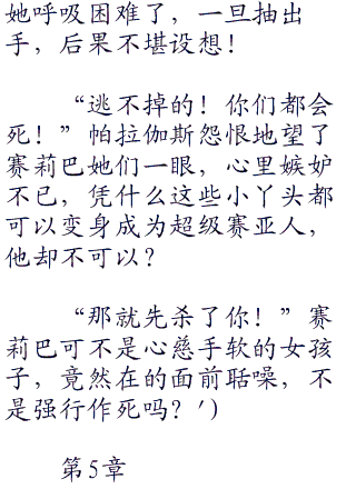 “那就让你见识一下超4吧!”赛莉巴已经知道,自己的超3绝对赢不了贝吉塔的,索性放开,变身最强状态!