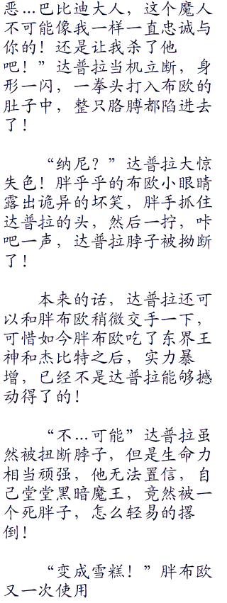魔人布欧的强大超乎了东界王神的想象,结果,没几下,就被打的生活不能自理了,身边的随从杰比特也差不多!
