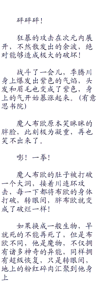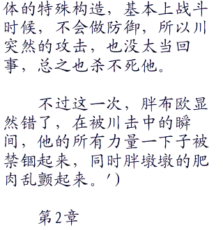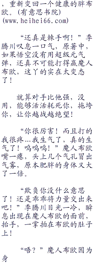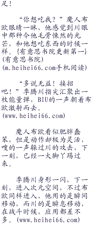 “啪!”巴比迪撞在布欧的大肚子上,再一次弹飞回来,季腾川毫不客气的又是一脚,巴比迪再一次飞过去,接着又被魔人布欧的肚子顶回来!