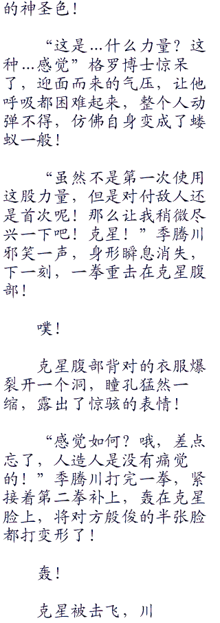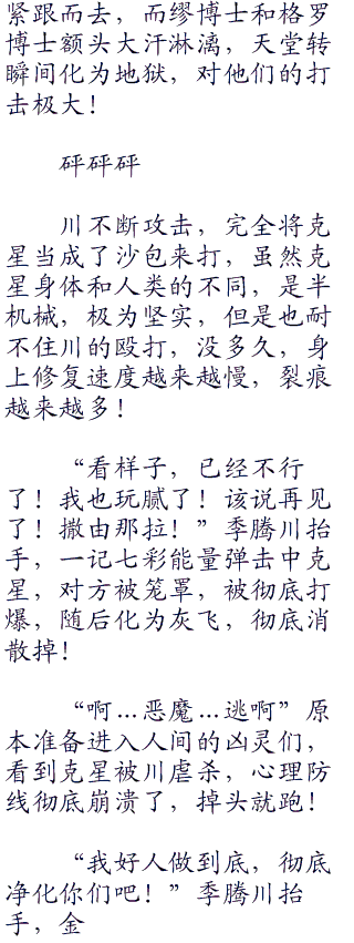 克星还是摆着一张臭脸,而季腾川看了看自己的手,都出现挫伤了,身上也疼的要命,好在他的恢复力变态至极,眨眼功夫就复原!