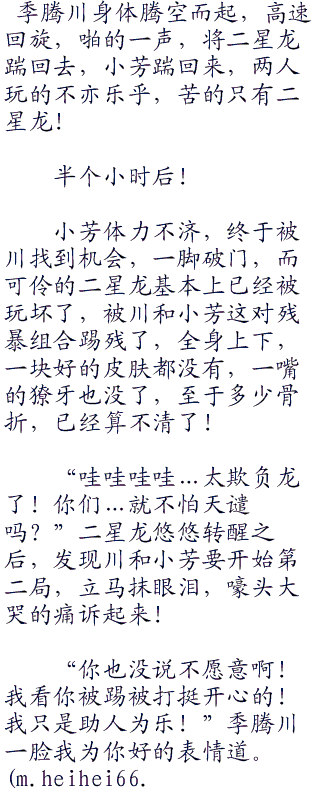 “你丫的…等着瞧,马上就让你们知道,鹿死谁手,呜呜呜哇…不要再打了,让我先歇息一分钟好不?”二星龙狠话刚说完,就忍受不住疼痛,小芳一拳比一拳重,打的哇哇大叫,虽然皮糙肉厚,但是也耐不住小芳的一记记芳拳!