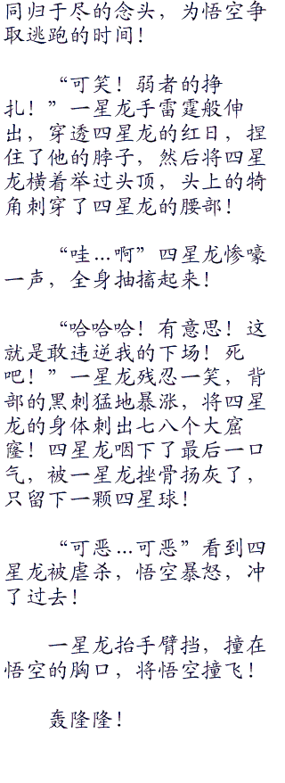 “四星龙!”孙悟空满含基情的一叫!有句话这么说来着,秀恩爱,死得快,老天爷通常不喜欢对立阵营的人相亲相爱,相恨相杀才是王道,混蛋!