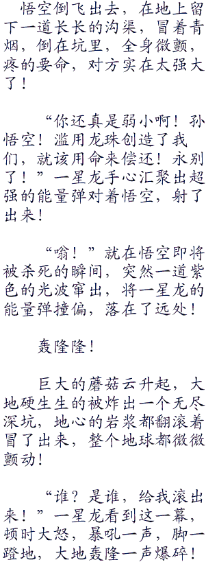 “小心!”四星龙面色一变,用躯体替悟空挡枪,原本就重伤之躯,又被来了一发,一声惨叫,抱着悟空滚了N圈,才停下来!