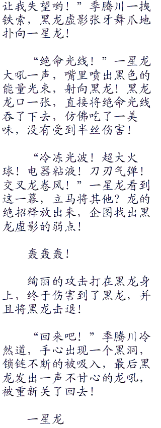 “不…可能…这到底是?”一星龙震惊失色地望向川身后由黑龙虚影,让他更加不可思的是这条黑龙脖子上拴着一条铁索,而铁索的末端就在川的手中。