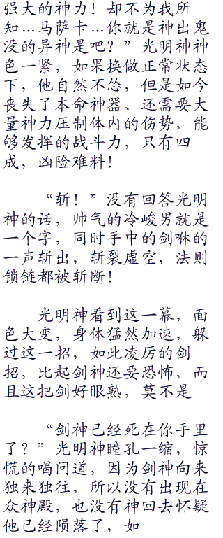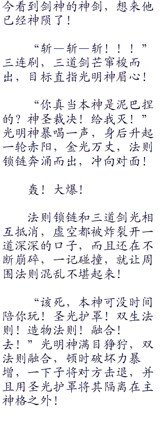 当然不仅如此,就连终极灭神虚空炮,也被摧毁了,在使用过后,正是灭神虚空炮最脆弱的时候,光明神也恰恰算准了这一点,没了致命危险武器,他得到主神格后,就可以统治神域,成为唯一真神!