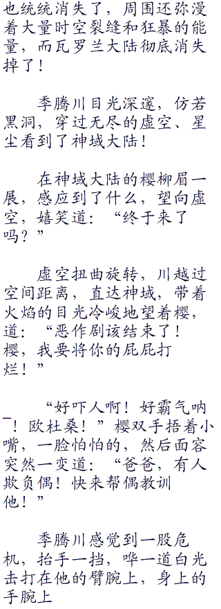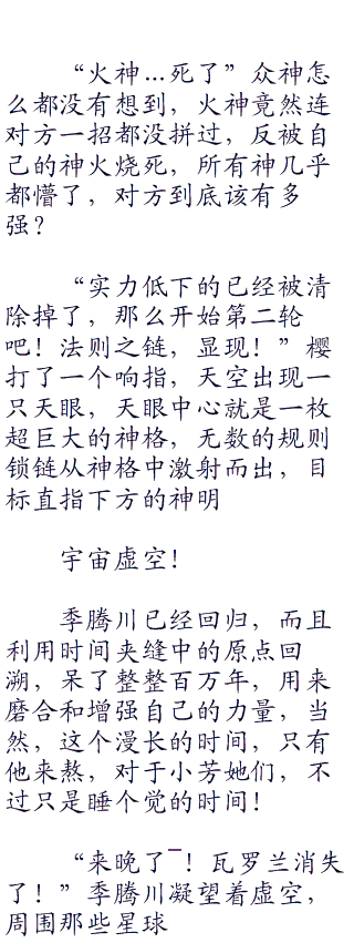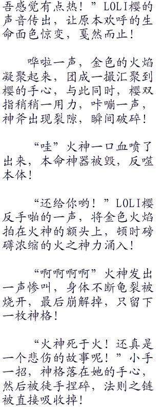 “神…罚…难道说”所有神明面色惨白一片,从刚刚的话语中,他们已经得知了重要的信息,那就是眼前的小LOLI就是‘天’,如今要‘割麦子’了!