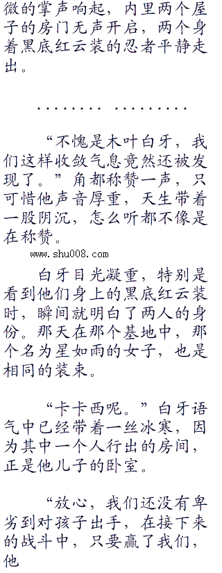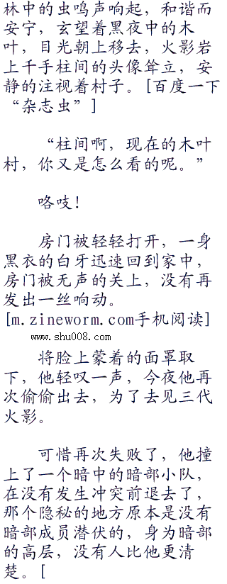 在他身后,则是两名穿着晓组织长袍的忍者,一人双眼放着绿光,半脸蒙面,看皮肤的颜色十分诡异。