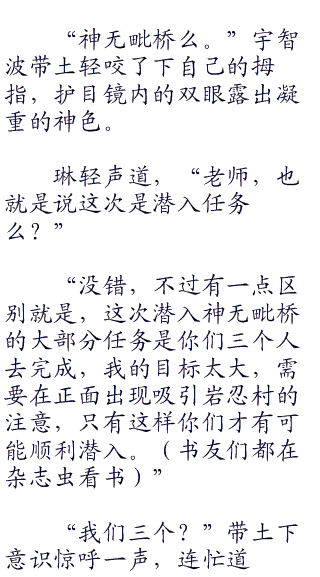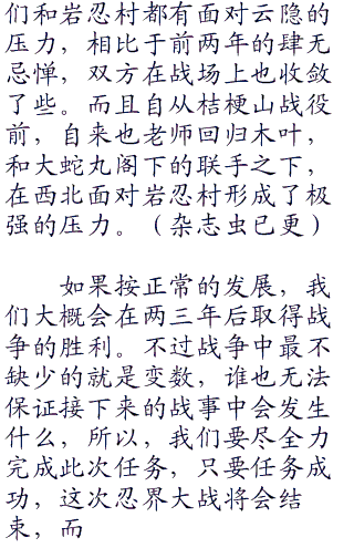 因此,这次任务的关键点不是实力,而是速度,一定要在岩忍村预料不到的情况下突袭神无毗桥,这才有可能一战尽功。