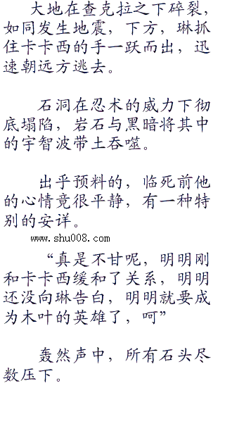 大地顿时响起隆隆之声,在狂暴的查克拉之下,原本就不牢固的山洞轰然塌陷,大小不一的岩石不停的跌落。而他本人,则在忍术发动的瞬间朝出口方向逃去,娴熟无比的逃离山洞。