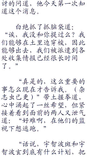 漩涡脸也耸肩道:“无论如何,带土你安心住下就好,跟着两位大人,是多少忍者梦寐以求的,好好养伤,以后你还有重要的使命呢。”