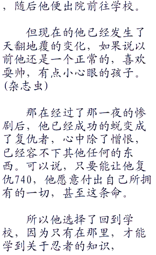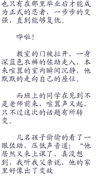 “你……什么意思?”宇智波佐助脸色铁青的问道,他已回忆起昨晚的场景,却强撑着不愿相信。