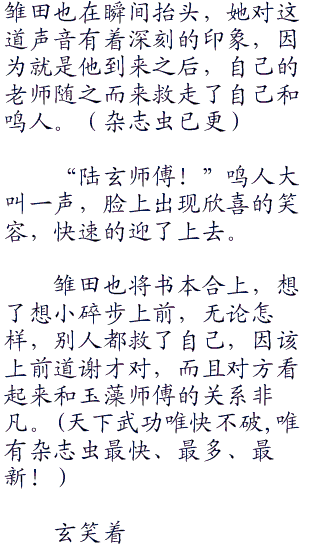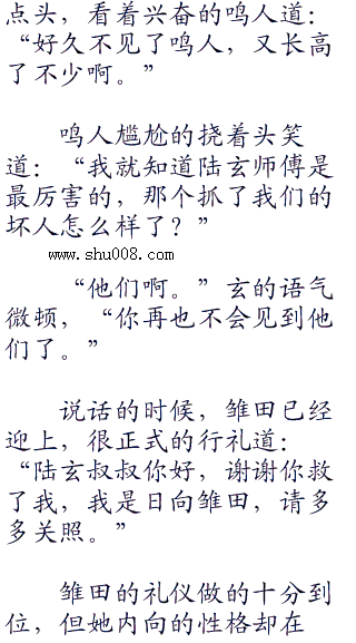 当然,有一点他是明白的,那就是自己是被陆玄师傅救出来的,而那个看起来很厉害的,被称为玉藻大人的女人,因该是雏田的老师。