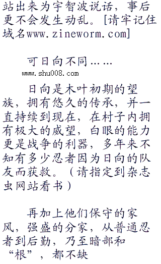 宇智波一族,虽说是木叶村的创始两族之一,可他们从宇智波斑和宇智波玄离开后,就再也没有进入过权利的中心,与整个木叶也有种格格不入的感觉,双方的颜色泾渭分明。