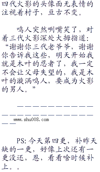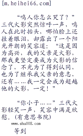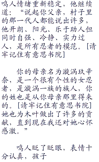 鸣人眼睛一大了,高兴道:“我就知道,我的父亲一定是一个大英雄,我做梦的时候曾经梦到过。快告诉我……快告诉我他的名