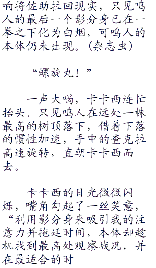 他头顶的鸣人化为白烟消失,而在他的视野中,起码二十多个鸣人出现,口中大叫着朝他冲来。