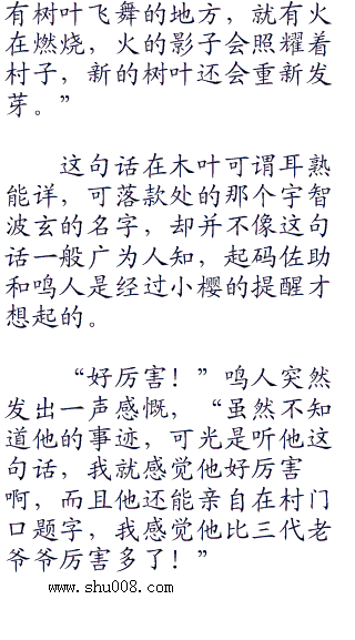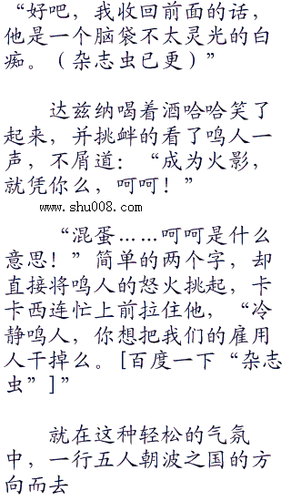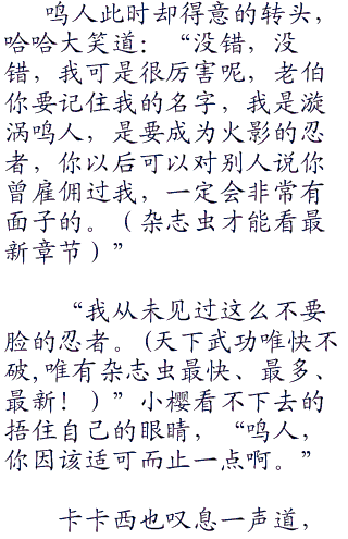 “我说,这个小鬼真的没问题么,你们木叶不会是故意糊弄我的吧。”跟在鸣人身后的一个怎么看都像农民工的老伯出言道,并狠狠的往口中灌了一口酒。