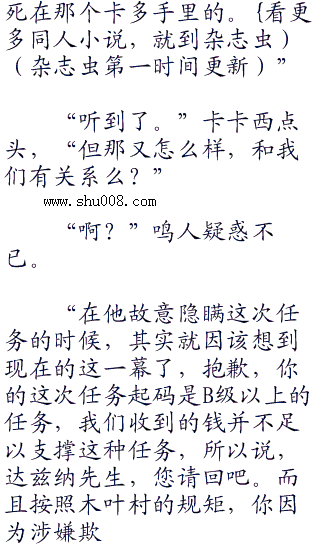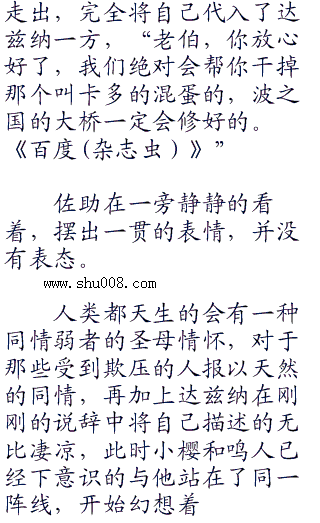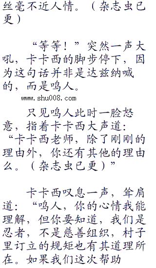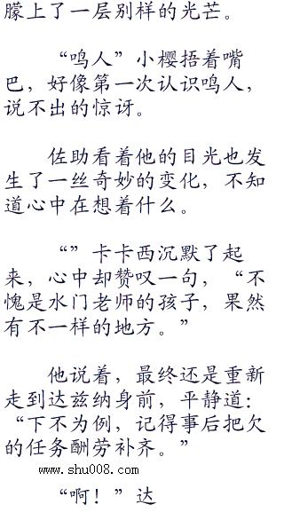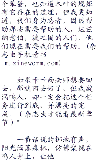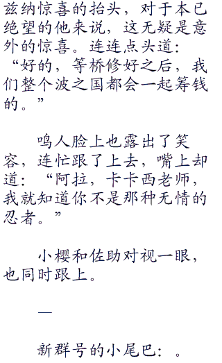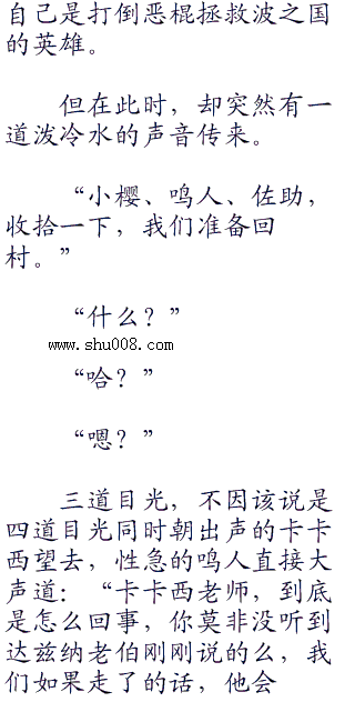 小樱握紧拳头“九三三”,低声道:“那个卡多好可恶,居然为了自己的一己之私让整个波之国都陷入与外界的长久隔离,卡卡西老师,我们帮帮达兹纳老伯吧。”