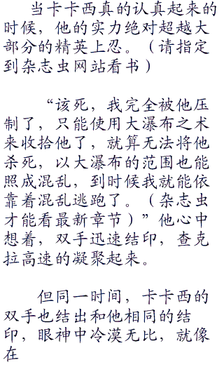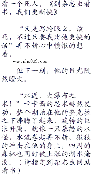水牢中的卡卡西笑着道:“吃惊么,呵呵,螺旋丸,传说中时空之神发明的a阶攻击忍术,由我的老师四代火影继承,别说是你的水分身,就算是你本人,如果被这招击中,也绝对不可能活命。”