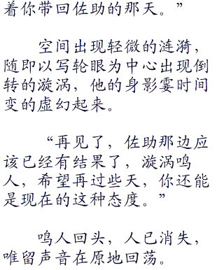 空间出现轻微的涟漪,随即以写轮眼为中心出现倒转的漩涡,他的身影霎时间变的虚幻起来。