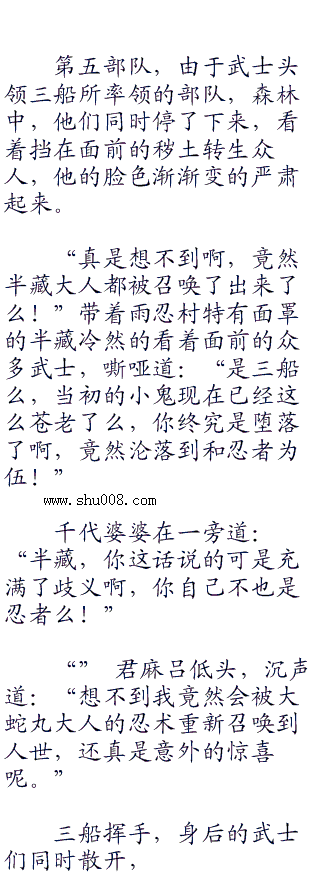 八万名忍者,被分成五个大的作战部队,以及若干特殊的小队,在火之国的范围内开始了一场浩大的战争。