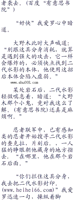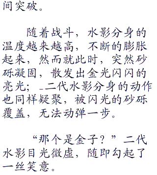 此时,二代水影的分身已朝众人冲了过来,我爱罗毫不犹豫的一挥手,黄砂突袭,却被对方瞬间躲过,转而另一个方向的忍