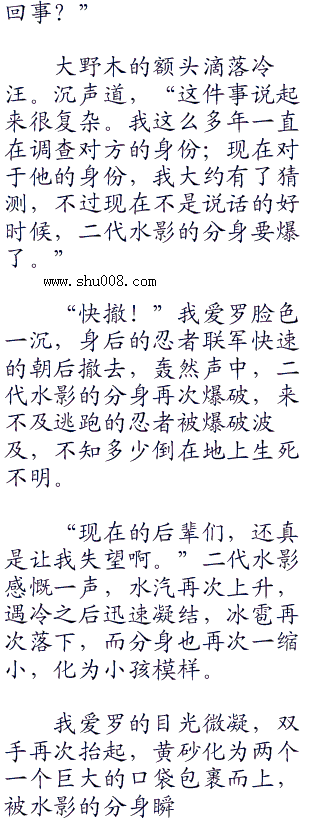 “怎么回事?”因为爆发的大过迅速。就连我爱罗都没来得及保护众人,第一时间朝爆炸的中心望去。只见在那里,二代水影的身体重新出现,并在天空下落的冰雹中急速缩小,转眼竟化为七八岁小孩的模样,右臂出现水遁凝结的寒刃。