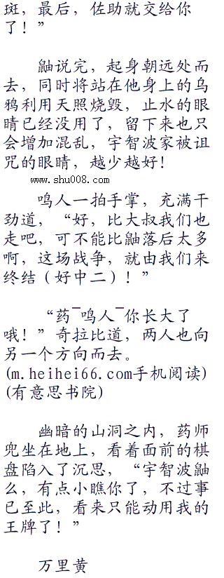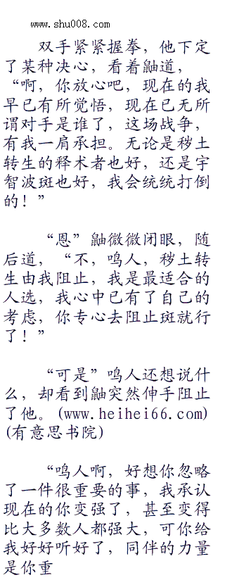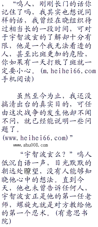 “呵!”长门的苦笑转为微笑,身影缓缓随着十拳剑朝前投去,低声道,“鸣人,接下来的事就拜托你了。你是三部曲中的完结篇,第一部自来也篇,整个篇幅堪称完美,是英雄的故事。然而第二部的我却误入了歧途,走在黑暗的道路上无法回头。第三部,希望鸣人你能够为大家带来大圆满的解决,最后,小心宇智波玄,他”