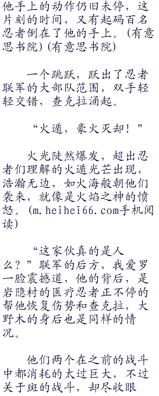 忍者联军中,惨叫声顿时此起彼伏,就像是一只猛虎撞入了羊群,不,比那更要可怕的多,应该说是一只霸王龙冲入了羊群,在交锋的第一瞬,无数的忍者已被高高抛起。