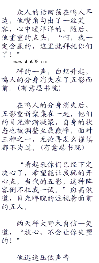 “干得漂亮水影!”四代雷影大喝一声,落在地面上满脸的兴奋。