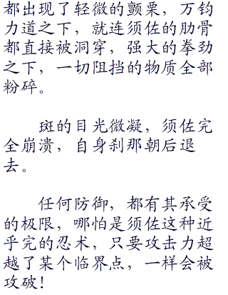 溶遁的溶浆之内,蓝色的光芒大盛,随着恐怖的查克拉爆发,成熟体的须佐自其中站起,宇智波斑冷眼看着众人,全身没有任何明显的伤势。