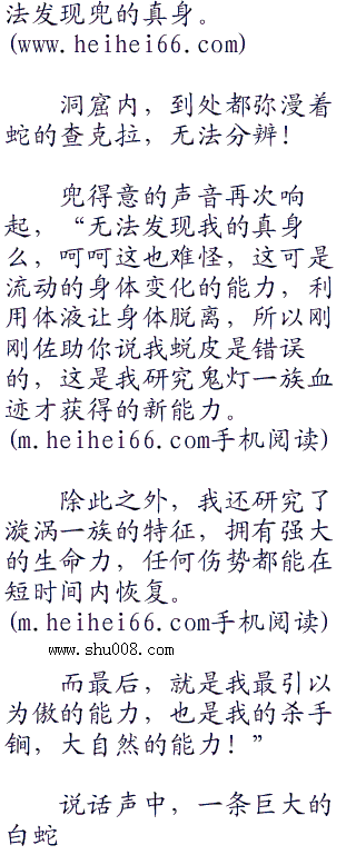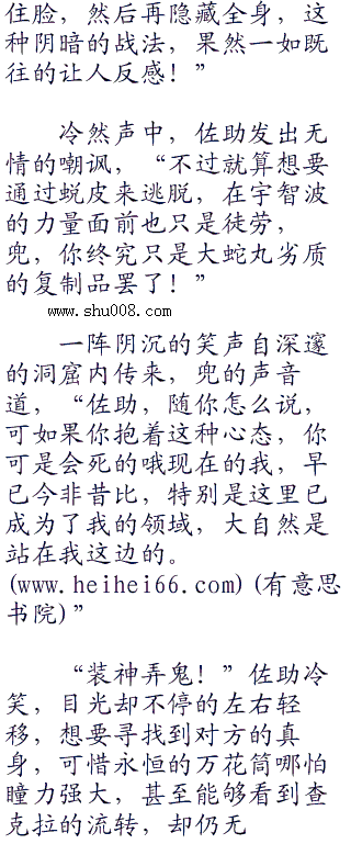 他本身的面貌则被头上的黑帽所遮掩,佐助眼中的三勾玉微转,冷笑道,“遮蔽眼睛利用蛇类感知我们的存在么,是一种应对幻术的好方法,只可惜仍没有用处!”