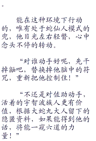 双手结印,查克拉注入下,身后的蛇类全部扩大一圈,随即咆哮着朝两人袭去。