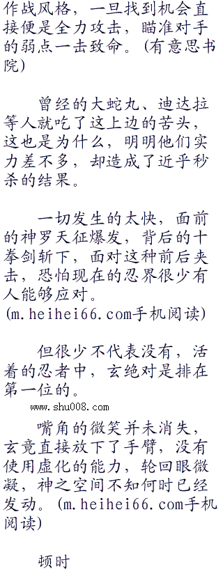几乎在同一时间,宇智波鼬的身影诡异的出现在玄的背后,在长门出手的一瞬间,他就已经消失,一直躲藏在边上寻找机会。