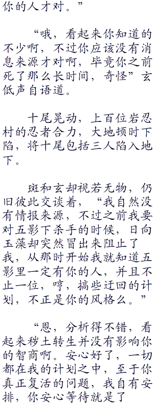 千手柱间想了想道,“在说之前,我还有件事想问一下,既然斑复活了的话,宇智波玄在哪?”