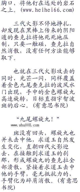 接连的攻击不停传来,覆盖在九尾身上的须佐铠甲迅速被瓦解,九尾不停的闪避,但在找不到攻击源头的情况下,根本无法做出应对,哪怕快速的移动,攻击仍不停地落在九尾身旁。
