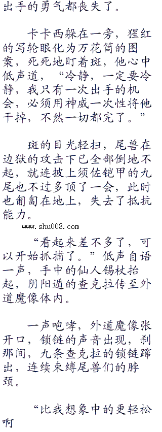 可饶是如此,九尾的状态也岌岌可危,它现在是唯一的还能活动的尾兽,