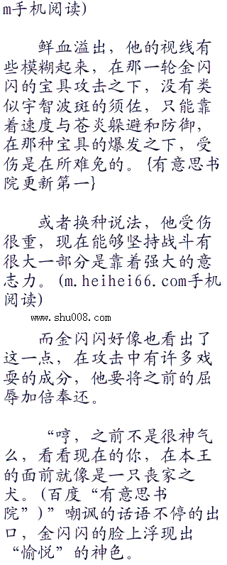 相反,金闪闪现在则是意气风发,只需要无脑的出剑就行了,每一剑或劈或刺,对方必然要想尽方法防御,不然剑上的诅咒之力侵入体内,会造成极难恢复的伤势。