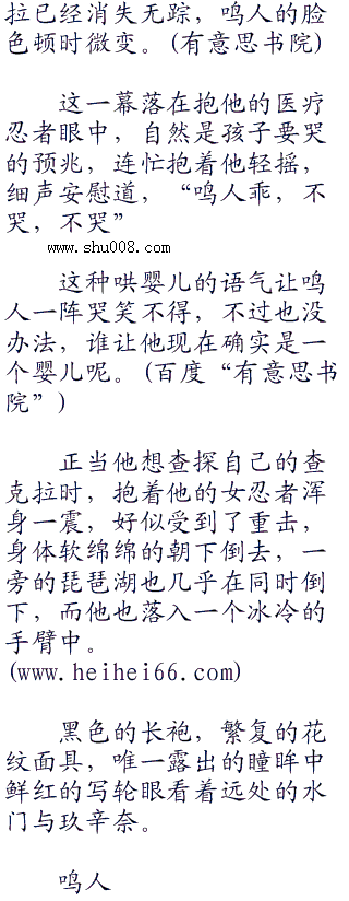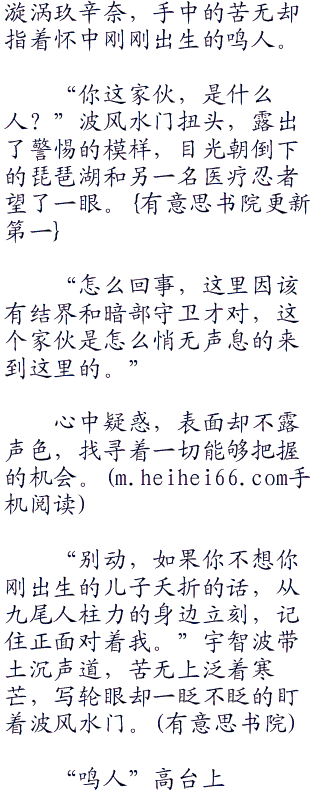 嘹亮的哭声在结界环绕的山洞内响起,琵琶湖的脸上露出笑容,将婴儿抱起交给旁边的医疗忍者。