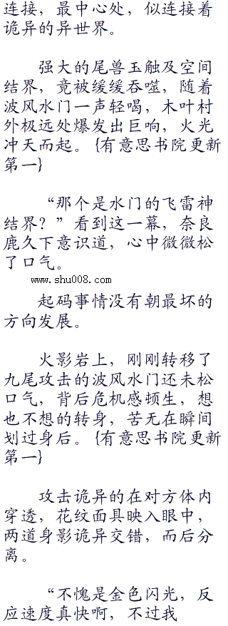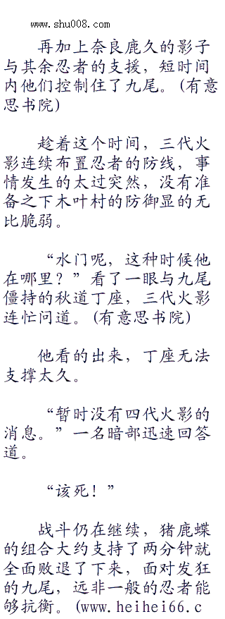 狂乱的影子自脚下出现,迅速朝九尾袭去,数秒后已触及九尾庞大的身体,顿时庞大的压力自影子上传来,奈良鹿久的额头出现冷汗,想要束缚九尾这种恐怖的存在,对他来说仍旧太过勉强。