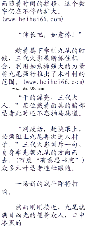 激战,已持续许久,短短的时间之内,九尾就已照成了木叶村大量的伤亡,大约五分之一的区域被毁,更有数不清的忍者丧命在它的手中。