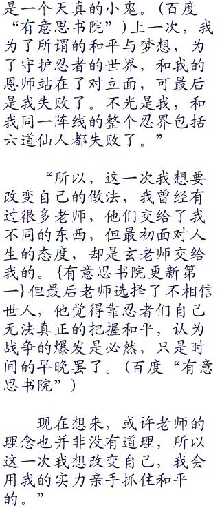 一幕幕的画面出现在九尾的脑海中,封印中的彼此敌视,被称之为妖狐的孤惨童年,一次次的任务与战斗,彼此间的对话,以及相互敞开心扉,共同经历的最后一次忍界大战。