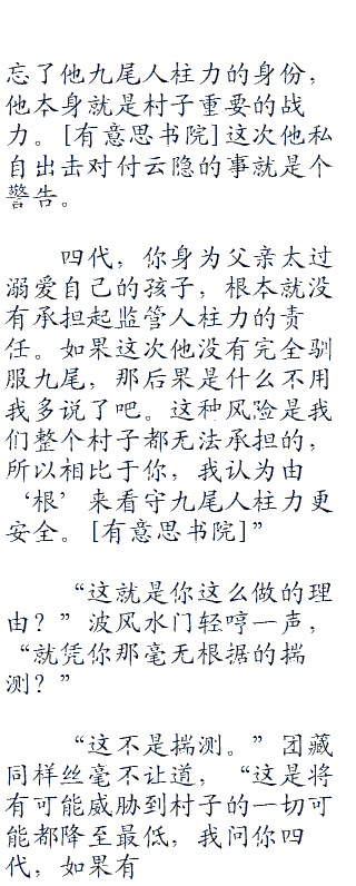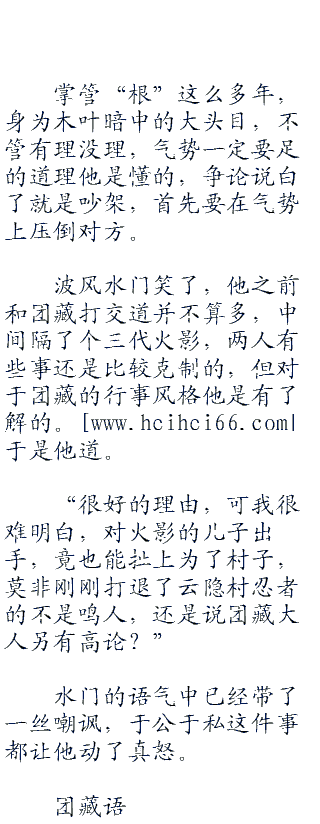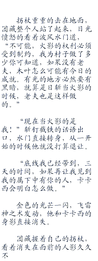 戴着面具的“根”部忍者行礼,不发一言的退出了房间。团藏的目光随之看向了波风水门的身后。