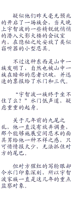 待清风吹过,原地已没有了宇智波鼬和宇智波佐助的身影,鸣人耸了耸肩。