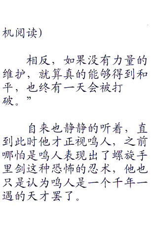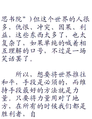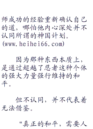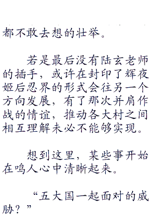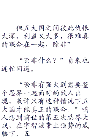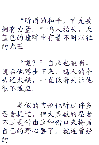 “好吧鸣人,不说其他的,你刚刚说的,和平需要忍者们自身的努力,我很有兴趣呢。这么多年来,我一直致力于寻找人与人之间相互理解的方法。只可惜,都最终失败了,鸣人,我倒是想听听你的见解。”