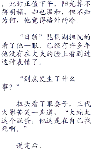 抬头看了看太阳,时间还早,自来也低声道,“算了,怎么折腾都随便他好了,有九尾的力量,就算是宇智波一族想对他不利也不容易。我还是去看望下大蛇丸那家伙好了,一晃又五年的时间没见了。”