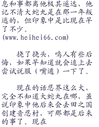 从大蛇丸的院中走出,时间已接近落日十分,自来也抬头看着落下的夕阳,觉得今天的大蛇丸有些怪怪的。)