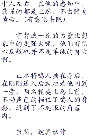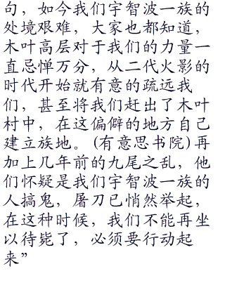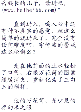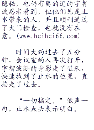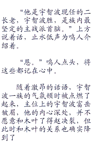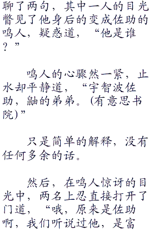 “快要到了,跟着我别出声。”宇智波止水的声音突然传来。鸣人连忙凝神低头,再也不左顾右盼。