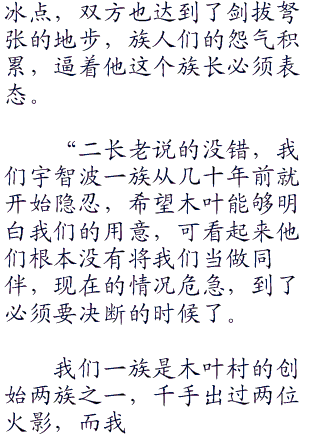 门前有两名宇智波的族人守候,根据鸣人的感知是两名上忍。